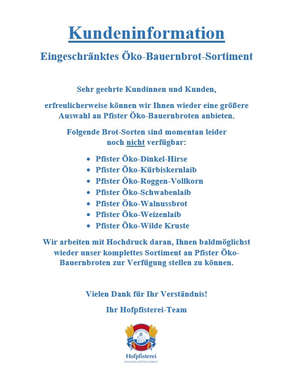 Wir arbeiten mit Hochdruck daran, Ihnen baldmöglichst wieder unser komplettes Sortiment an Pfister Öko-Bauernbroten zur Verfügung stellen zu können.
